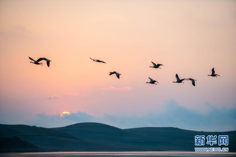 日出時(shí)分,黑頸鶴在大山包黑頸鶴國家級(jí)自然保護(hù)區(qū)飛翔(2月25日攝)。新華社記者 胡超 攝