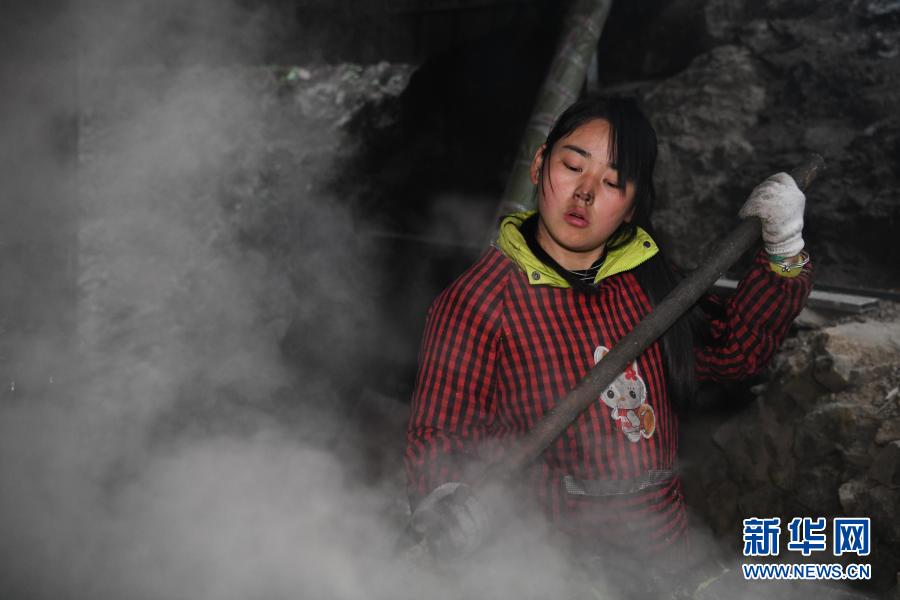 張志菊在自家的農(nóng)場(chǎng)里準(zhǔn)備豬飼料(2月25日攝)。