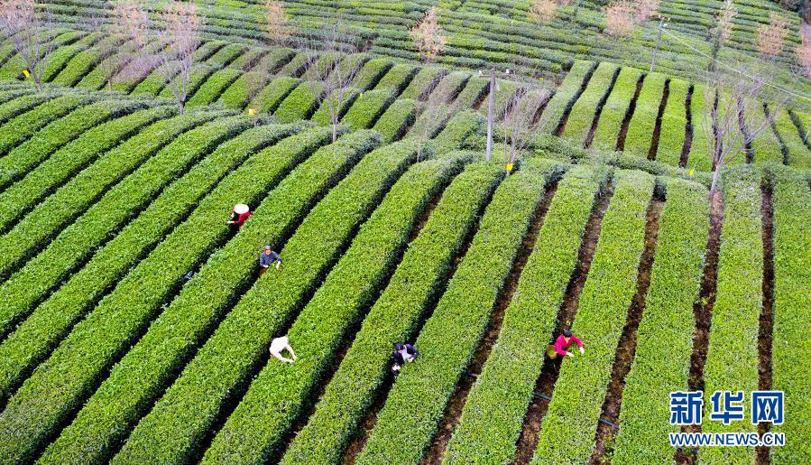 3月4日,茶農(nóng)在安康市漢濱區(qū)流水鎮(zhèn)剛子茶葉專業(yè)合作社標(biāo)準(zhǔn)化茶園采摘新茶(無人機(jī)照片)。新華社記者 陶明 攝