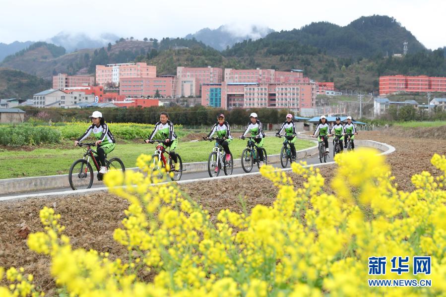 3月8日,自行車騎行愛好者在貴州省遵義市余慶縣觀光園內騎行健身。