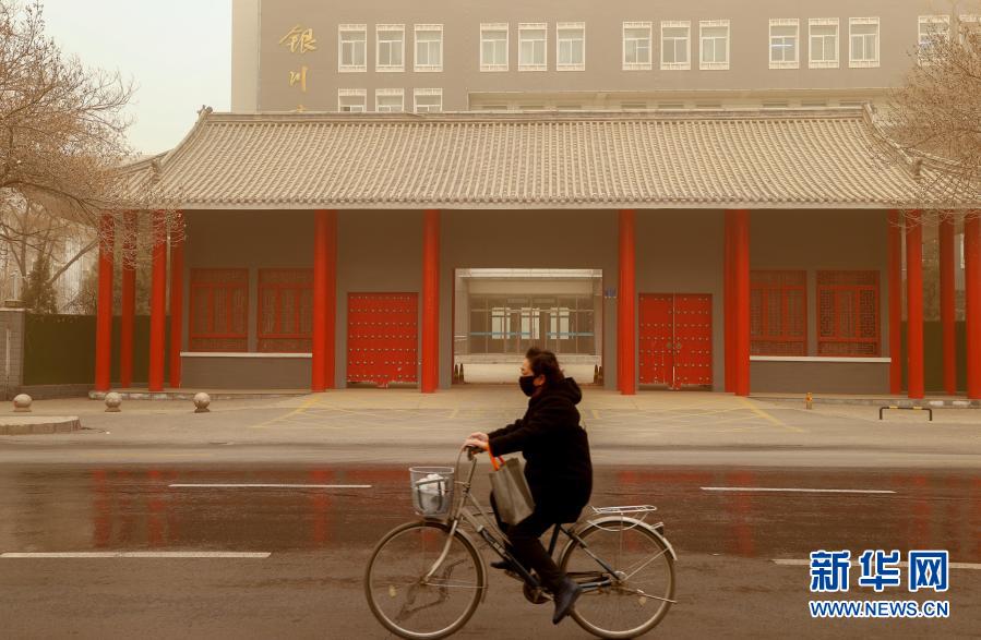 3月15日,在寧夏銀川市興慶區(qū)文化街,市民在沙塵中騎行。當(dāng)日,我國北方多地出現(xiàn)沙塵天氣。新華社記者 楊植森 攝