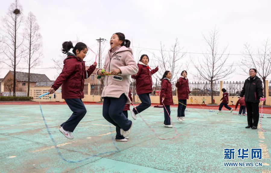 騎路小學劉彥老師(右一)放學后輔導學生練習花樣跳繩(3月9日攝)。新華社記者 楊磊 攝
