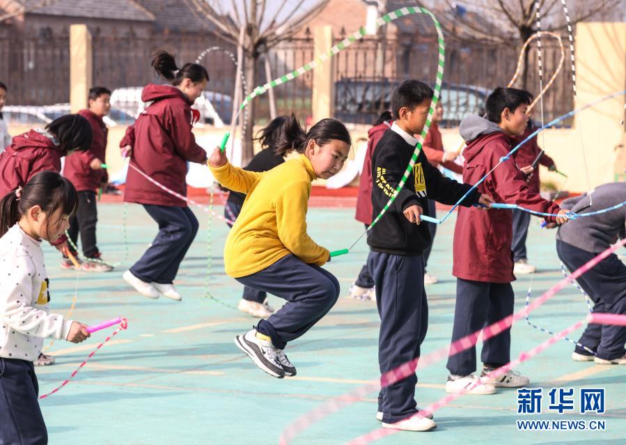 騎路小學(xué)的學(xué)生們在體育課上進行跳繩鍛煉(3月10日攝)。新華社記者 楊磊 攝