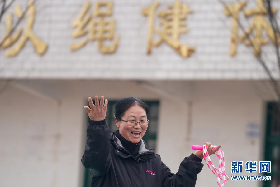 騎路小學(xué)劉彥老師為正在跳繩的學(xué)生們加油打氣(3月9日攝)。新華社記者 李博 攝