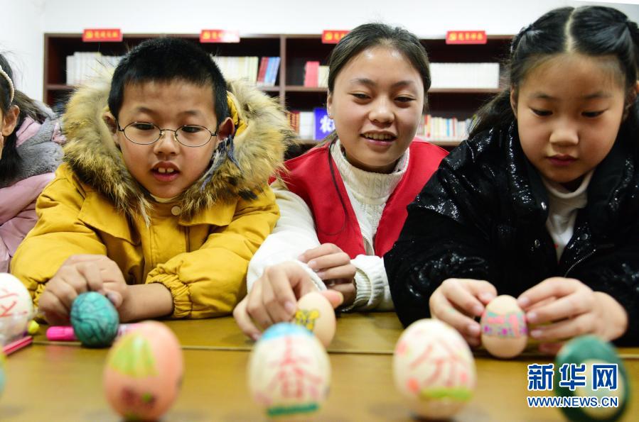 3月20日,在江蘇省鎮(zhèn)江市新金江社區(qū),江蘇大學(xué)志愿者和小朋友一起玩“立蛋”游戲。