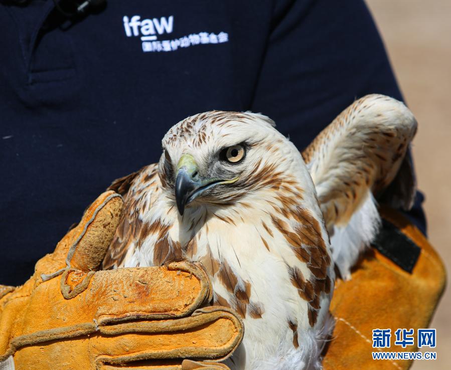 3月20日,北京猛禽救助中心猛禽康復(fù)師周蕾準備放飛大鵟。新華社記者 李京 攝