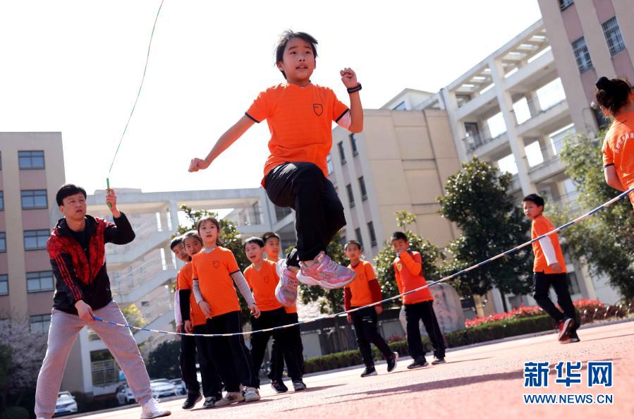 3月23日,在合肥市大通路小學(xué)新海校區(qū),學(xué)生在大課間練習(xí)花樣跳繩。