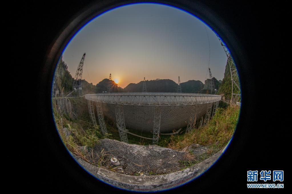 3月29日拍攝的晚霞中的“中國天眼”全景(維護(hù)保養(yǎng)期間魚眼鏡頭拍攝)。