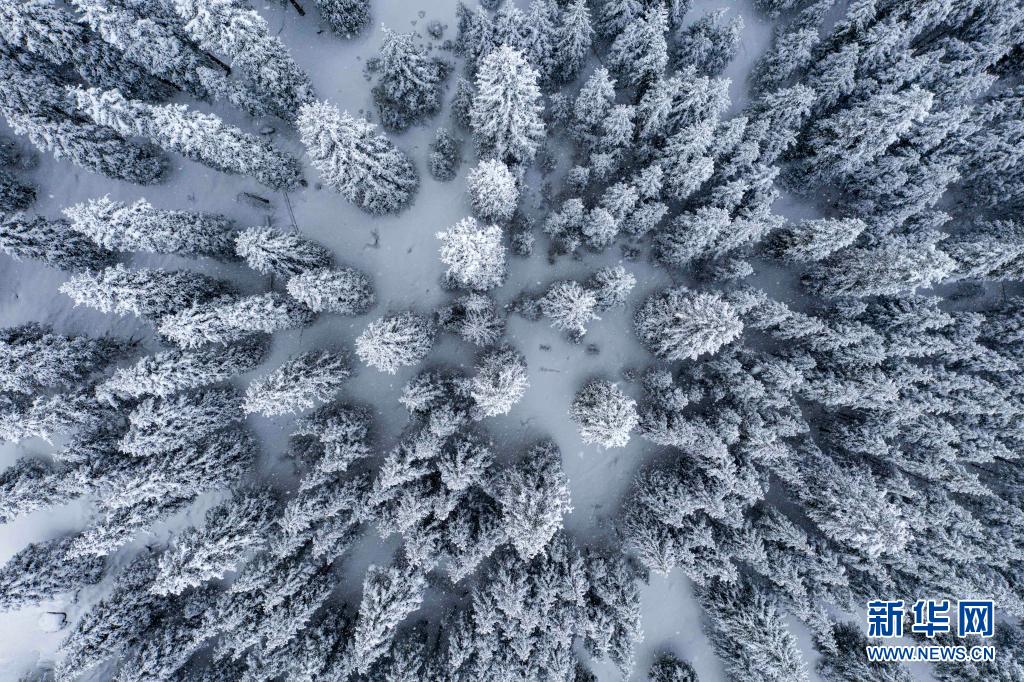 3月30日,大雪降落在新疆沙灣市鹿角灣的雪嶺云杉森林間(無(wú)人機(jī)照片)。