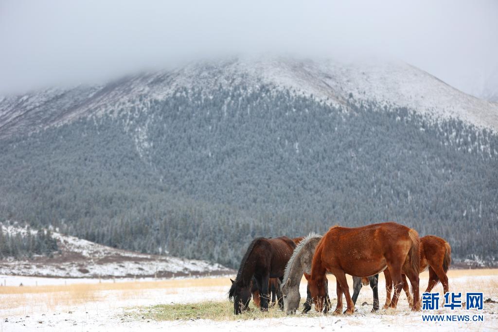 當(dāng)日,受冷空氣影響,位于甘肅省河西走廊中部、祁連山北麓的山丹馬場(chǎng)降雪,馬群在雪原上奔跑覓食,構(gòu)成了一幅壯美高原雪景 。