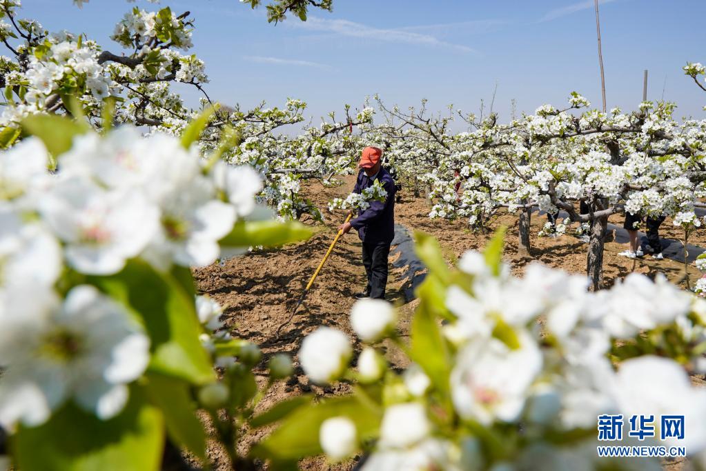 4月5日,在江蘇省連云港市贛榆區(qū)贛馬鎮(zhèn)黑坡村黃金梨基地內(nèi),果農(nóng)給梨樹(shù)松土。