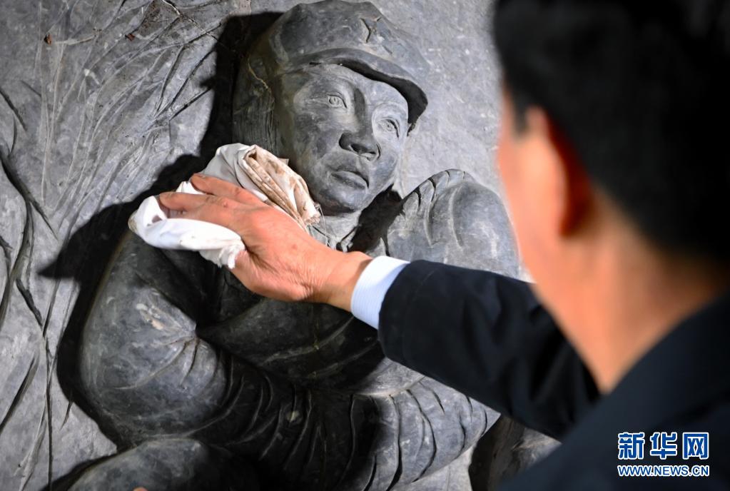 4月2日,曾祥有在金剛臺(tái)紅軍洞里擦拭雕塑。