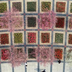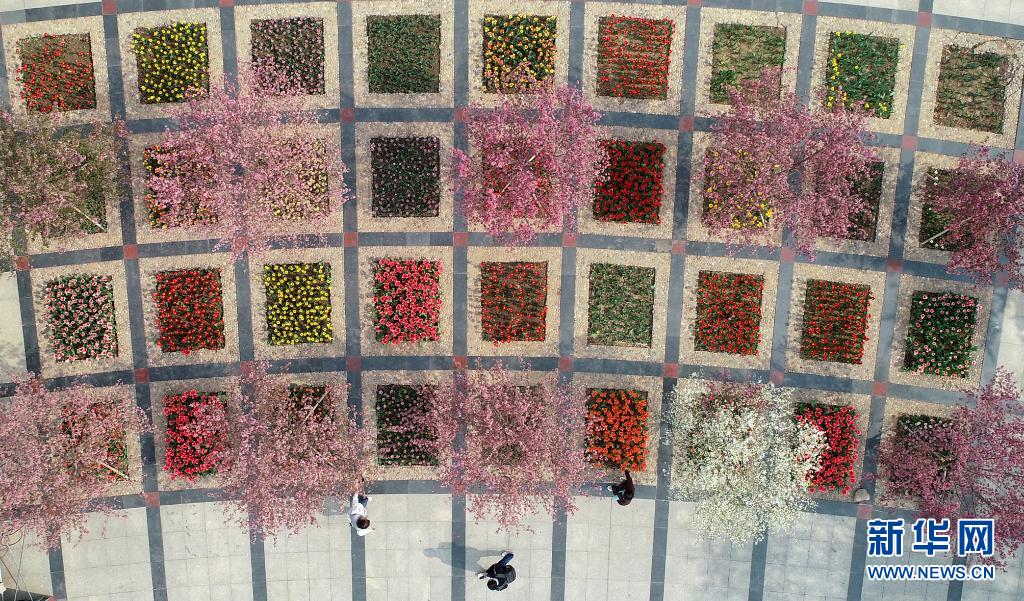4月8日拍攝的石家莊市植物園內(nèi)的郁金香展(無(wú)人機(jī)照片)。
