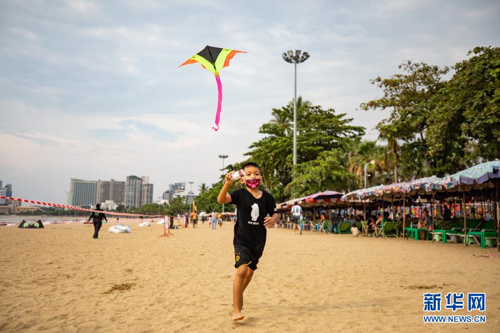4月9日,一名兒童在泰國芭堤雅海灘上放風箏。