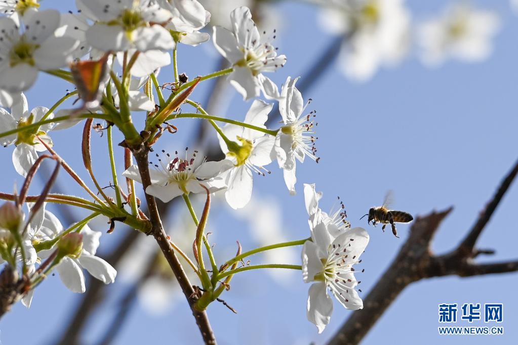 4月11日,在鐵門關(guān)市一處梨園,蜜蜂在授粉。新華社記者 丁磊 攝