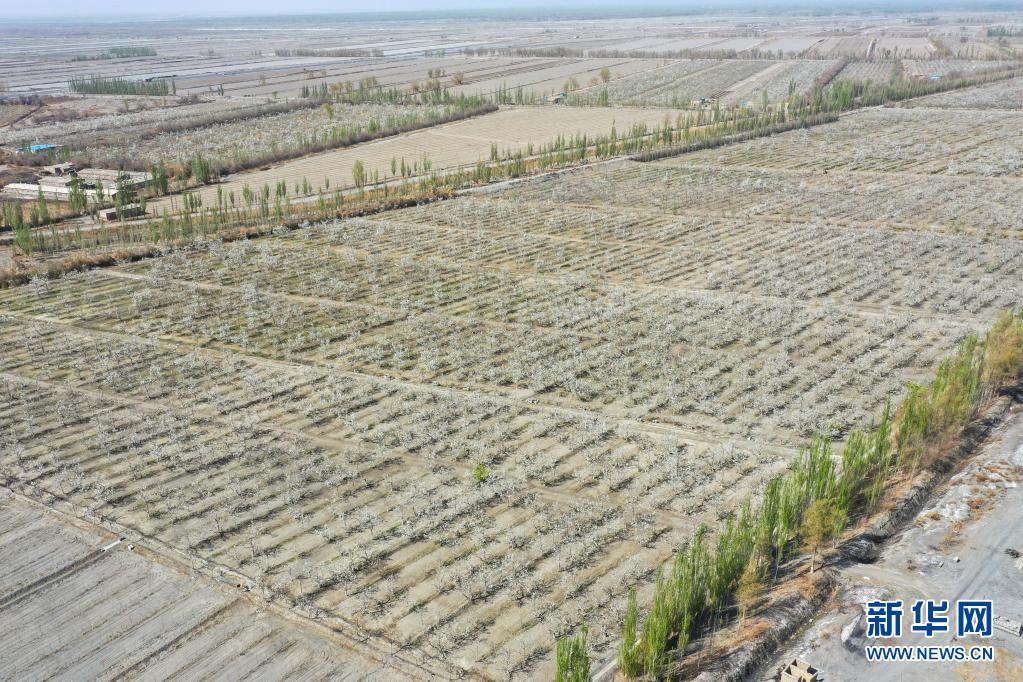這是4月11日在鐵門關(guān)市拍攝的一處梨園(無(wú)人機(jī)照片)。新華社記者 丁磊 攝