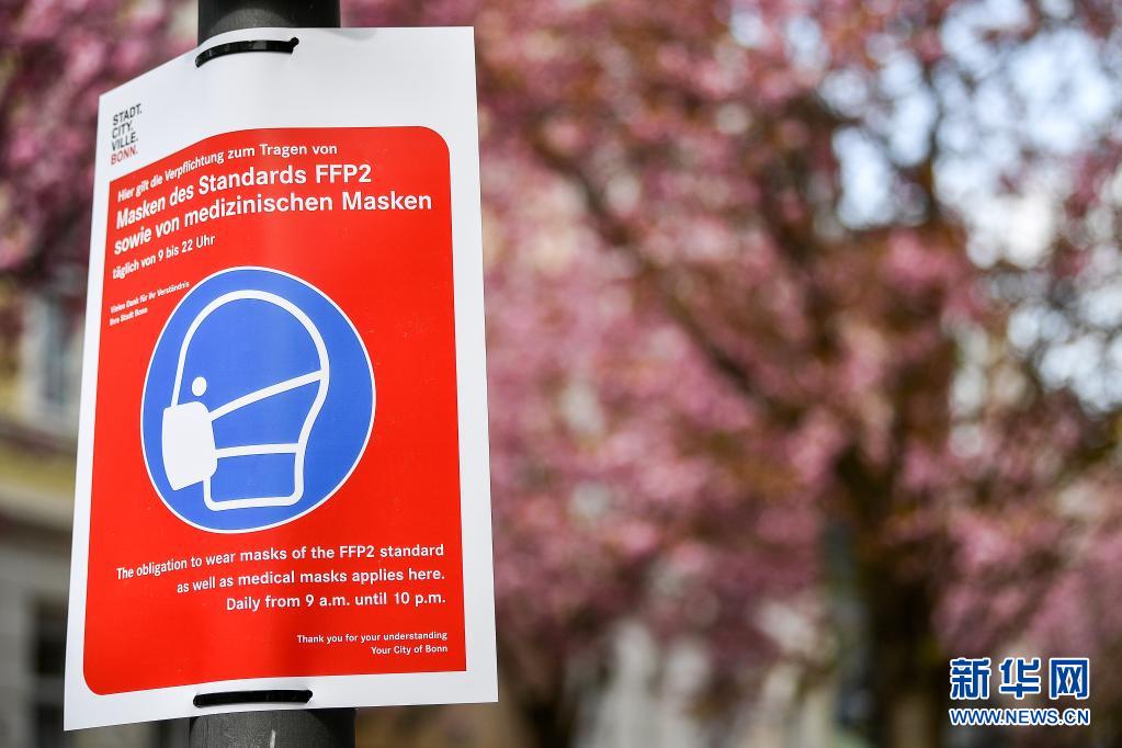 4月13日,德國波恩老城區(qū)的櫻花樹下張貼著提示游人佩戴醫(yī)用口罩的標(biāo)識。