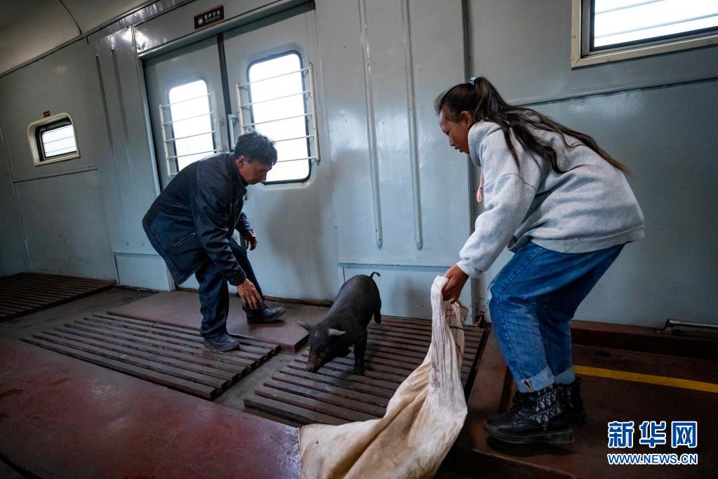 在5633次列車的行李車廂,乘客準備把他們帶上車的小豬裝到袋子里。為了方便群眾運送動物,5633/5634次列車對行李車廂專門進行改造,黃牛、山羊、豬、馬,都是這兒的“常客”。新華社記者 沈伯韓 攝