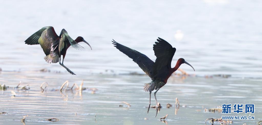 彩鹮在福建省霞浦縣福寧灣灘涂覓食、嬉戲(4月17日攝)。一對彩鹮近日現(xiàn)身福建省霞浦縣福寧灣灘涂的視頻,經(jīng)當(dāng)?shù)孛襟w播發(fā)后引起轟動,各地攝影師及當(dāng)?shù)厣鷳B(tài)保護志愿者紛至沓來,一睹它們的“芳容”。新華社記者 梅永存攝