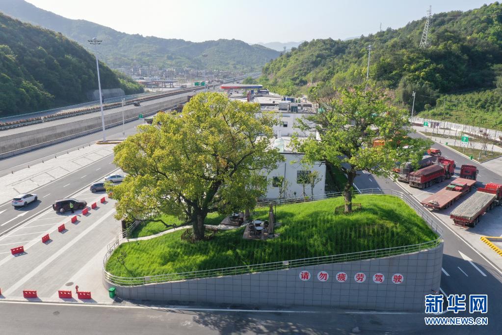 杭州第二繞城高速西復(fù)線次塢服務(wù)區(qū)有3棵樹齡在100年以上的古樹。服務(wù)區(qū)在建設(shè)過程中,將古樹保護(hù)起來,現(xiàn)已成為一道特色景觀。新華社發(fā)(郭斌 攝)