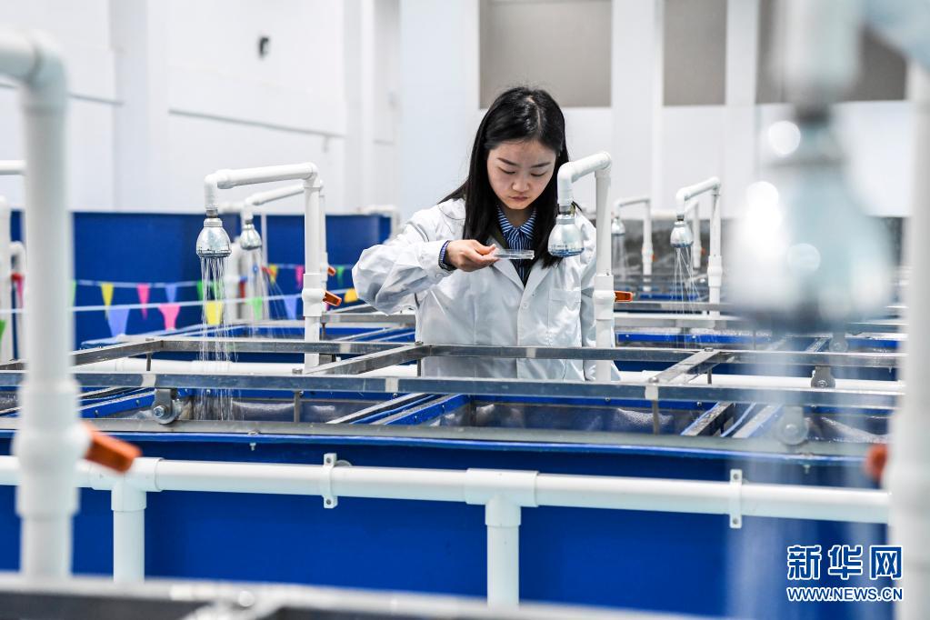 4月20日,大藤峽魚類增殖放流站的袁婷博士觀察待孵化的魚卵。