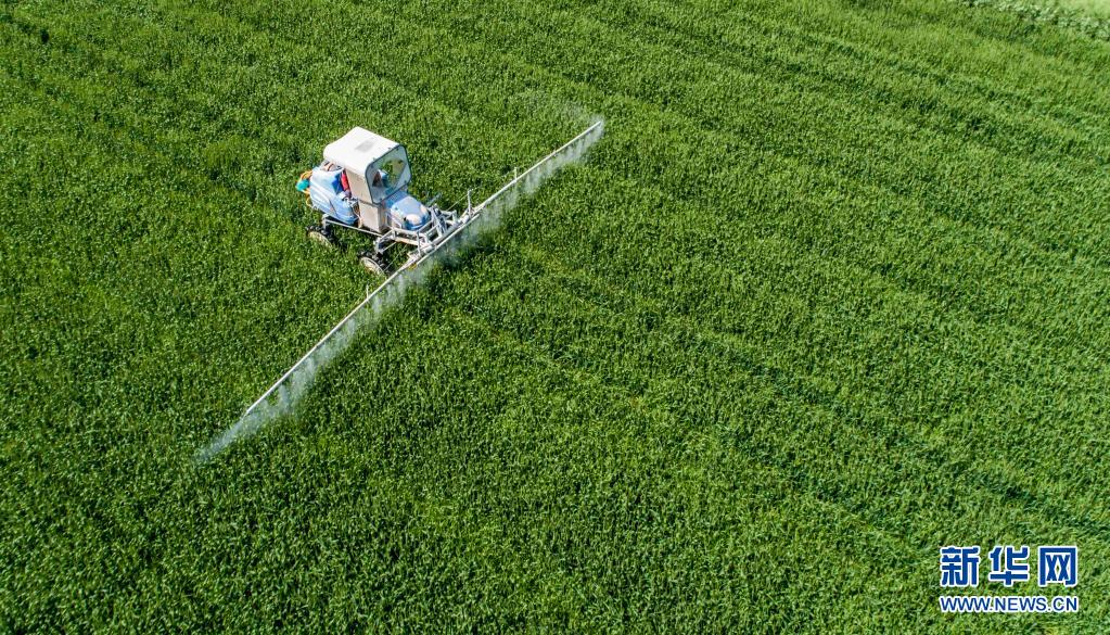 4月20日,在江蘇省海安市隆政街道聯(lián)合村,農(nóng)民駕駛自走式噴桿噴霧機在麥田噴灑農(nóng)藥(無人機照片)。