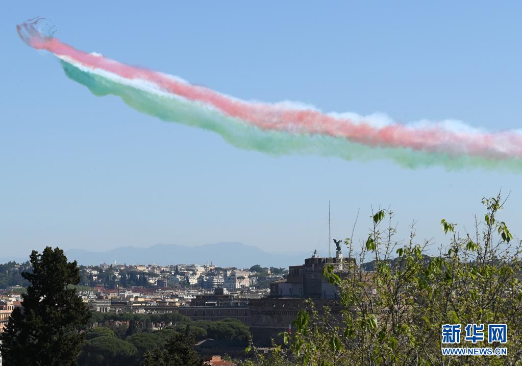 4月25日,意大利“三色箭”飛行表演隊在羅馬舉行的紀(jì)念儀式上噴出代表意大利國旗顏色的紅白綠三色煙霧。
