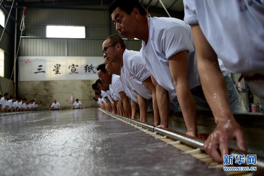 近日,在宣紙產(chǎn)地安徽省宣城市涇縣,“四丈宣紙”的抄制在一家紙業(yè)有限公司啟動(dòng)。50余名撈紙師傅操作巨型紙簾,齊心協(xié)力,在紙槽旁進(jìn)行撈紙作業(yè)。來(lái)回起落兩次,動(dòng)作整齊劃一。隨后工人們將紙簾吊起放至一邊揭下,一張巨大的宣紙便撈制成功。經(jīng)過(guò)曬、剪等工序后, 制成長(zhǎng)13.2米、寬3.6米的巨型宣紙就是“四丈宣紙”。