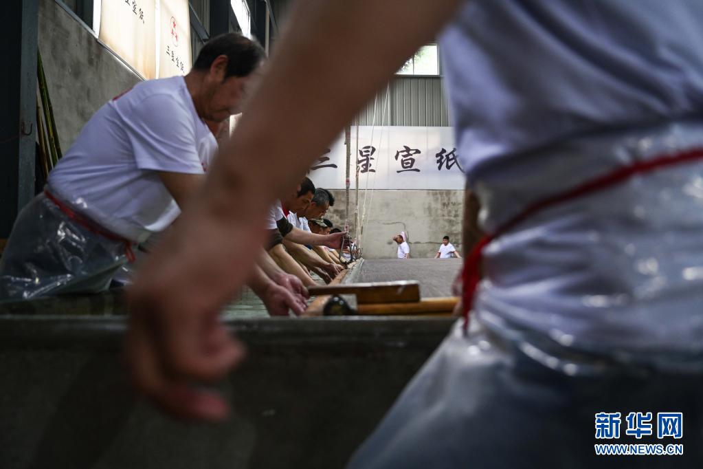 4月22日,在安徽宣城市涇縣“四丈宣紙”生產(chǎn)車(chē)間,工人在進(jìn)行撈紙作業(yè)。