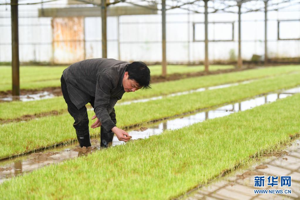 4月12日,在湖南省益陽市赫山區(qū)歐江岔鎮(zhèn)牌口村,劉進良在育秧棚里查看秧苗生長情況。新華社記者 陳澤國 攝