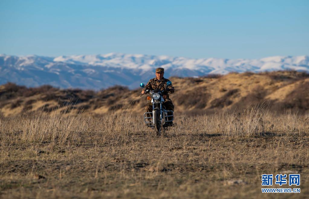 新疆生產(chǎn)建設(shè)兵團(tuán)第10師185團(tuán)職工馬軍武騎摩托行駛在管護(hù)轄區(qū)內(nèi)(4月9日攝)。