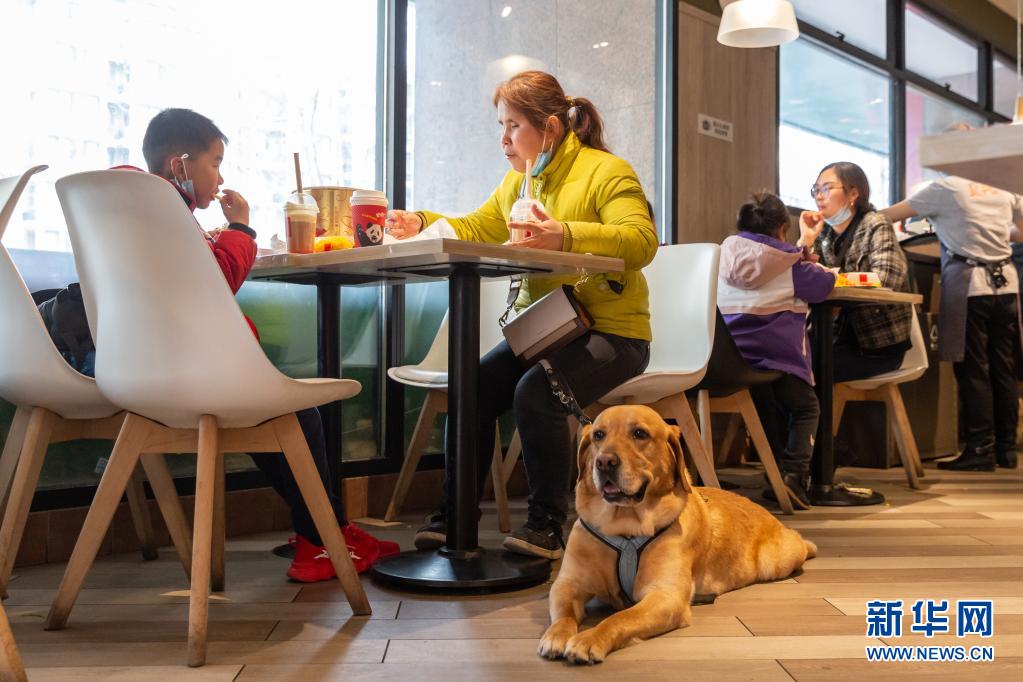 祝愛(ài)葉和兒子在餐廳吃飯的時(shí)候,導(dǎo)盲犬“多多”靜靜地趴在祝愛(ài)葉身邊(3月13日攝)。