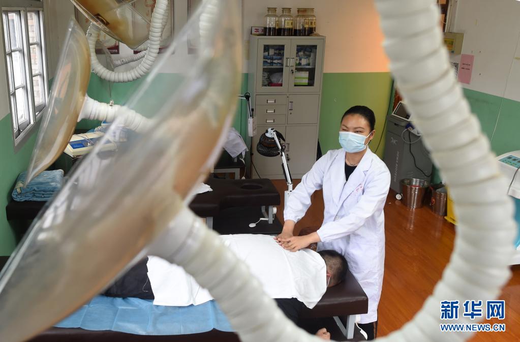 4月28日,葉景芬(前)在自己實(shí)習(xí)的龍泉市中醫(yī)院內(nèi)為患者做推拿。新華社記者 韓傳號 攝