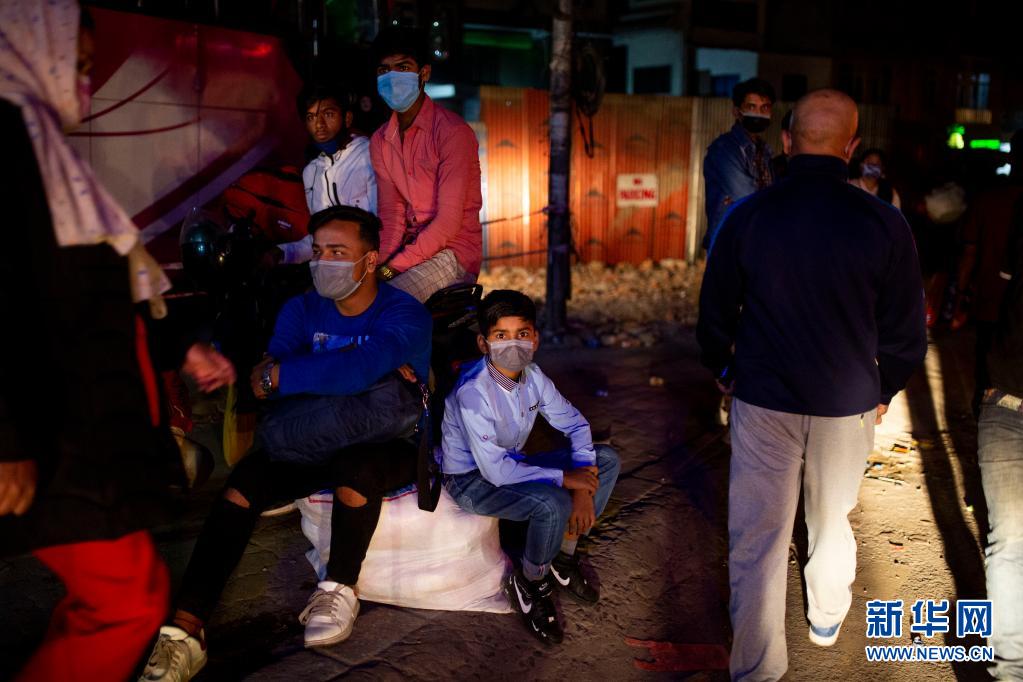 4月28日晚,人們在尼泊爾首都加德滿都的路邊等車,準(zhǔn)備在封禁措施實(shí)施前離開加德滿都返回家鄉(xiāng)。
