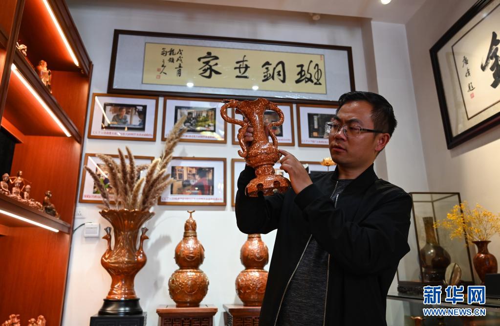 地處滇東北、烏蒙山腹地的云南會(huì)澤縣流傳著具有300多年歷史的斑銅制作工藝。斑銅工藝復(fù)雜,要采用高品位的銅為原料,經(jīng)過(guò)20余道工序制作而成。產(chǎn)品“妙在有斑,貴在渾厚”,風(fēng)格獨(dú)樹(shù)一幟。33歲的張偉是會(huì)澤“張氏斑銅”的第十三代傳人。自幼深受地域文化和家庭熏陶的他,大學(xué)畢業(yè)后,返鄉(xiāng)從事斑銅制作工作。在會(huì)澤古城的“銅匠街”,張偉創(chuàng)辦了斑銅傳習(xí)館,不斷研發(fā)斑銅新產(chǎn)品、傳承著這項(xiàng)非遺技藝。“斑銅是一種情感、一種文化,希望在我們這代人的努力下能夠更好地將它傳承下去,讓更多人了解斑銅的獨(dú)特魅力。”張偉說(shuō)。