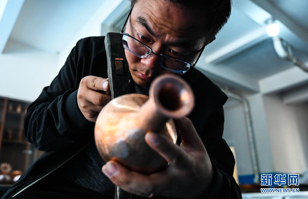 地處滇東北、烏蒙山腹地的云南會(huì)澤縣流傳著具有300多年歷史的斑銅制作工藝。斑銅工藝復(fù)雜,要采用高品位的銅為原料,經(jīng)過(guò)20余道工序制作而成。產(chǎn)品“妙在有斑,貴在渾厚”,風(fēng)格獨(dú)樹(shù)一幟。33歲的張偉是會(huì)澤“張氏斑銅”的第十三代傳人。自幼深受地域文化和家庭熏陶的他,大學(xué)畢業(yè)后,返鄉(xiāng)從事斑銅制作工作。在會(huì)澤古城的“銅匠街”,張偉創(chuàng)辦了斑銅傳習(xí)館,不斷研發(fā)斑銅新產(chǎn)品、傳承著這項(xiàng)非遺技藝?!鞍咩~是一種情感、一種文化,希望在我們這代人的努力下能夠更好地將它傳承下去,讓更多人了解斑銅的獨(dú)特魅力?!睆垈フf(shuō)。