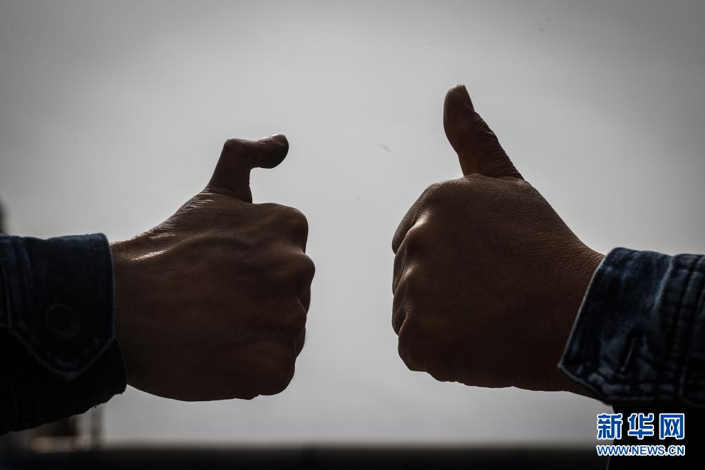 4月30日,王尚典(左)與同事一起做出“贊”的手勢。