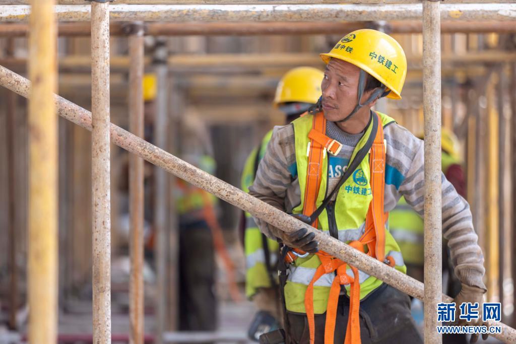 5月1日,中鐵建工集團(tuán)上海九星城項(xiàng)目的工人在工地搭設(shè)腳手架。