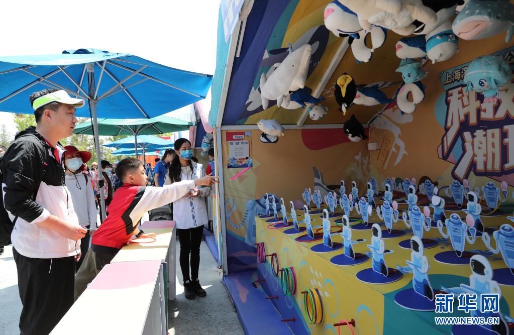 5月1日,游客們?cè)谏虾:2Q蠊珗@內(nèi)玩游戲。