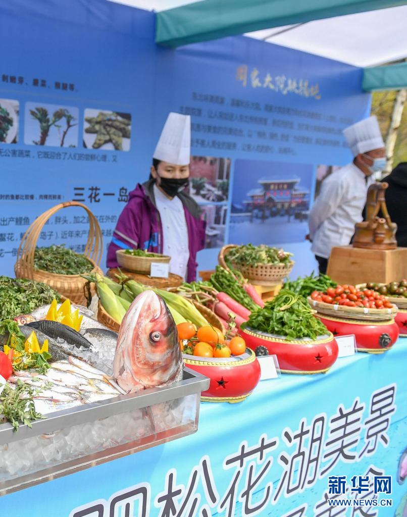 5月1日,在吉林市萬科松花湖度假區(qū)夏季運(yùn)營啟幕儀式現(xiàn)場,廚師展示開江魚和山野菜等當(dāng)?shù)靥厣朗场?/p>