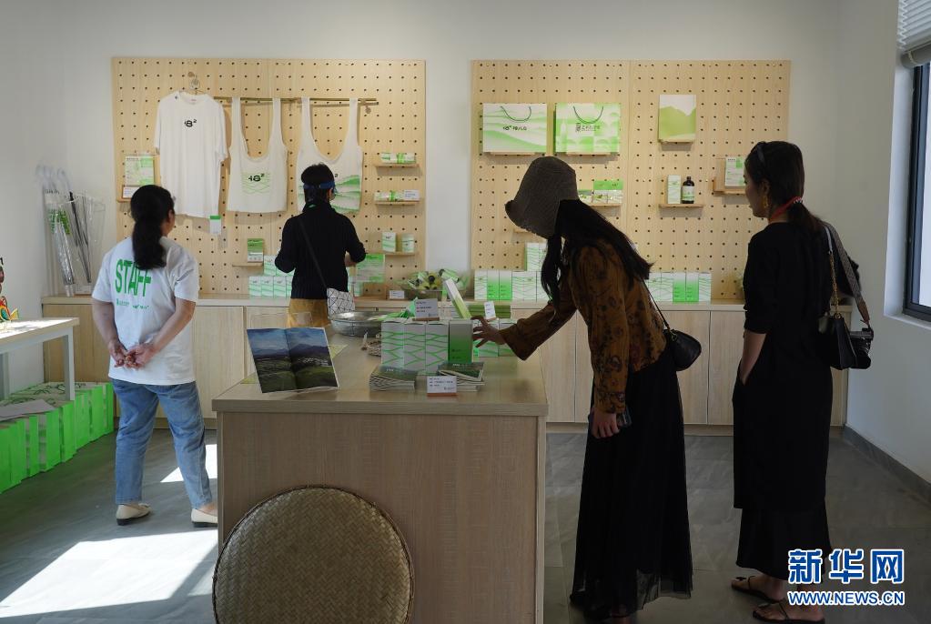 5月1日,參觀者在浮梁縣寒溪村挑選藝術展文創(chuàng)用品。