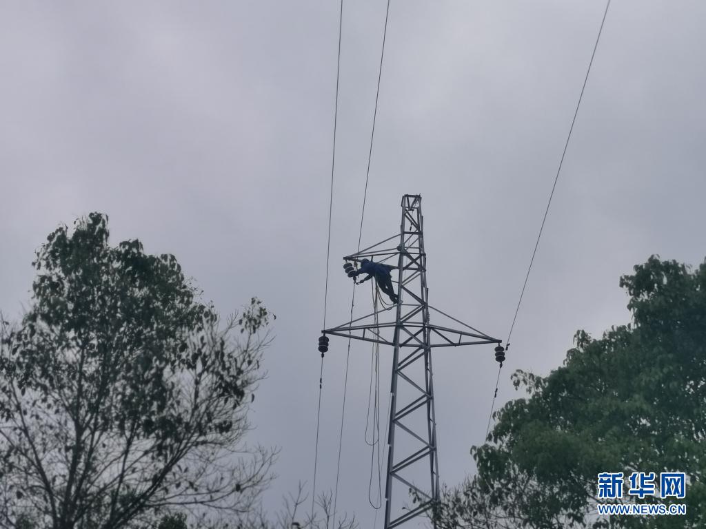“跑山電工”黨員服務(wù)隊隊員在塔上連接線路(5月3日攝)。