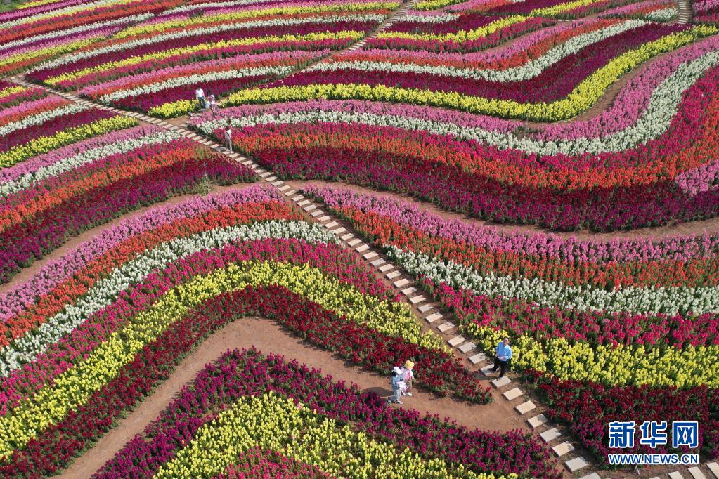 5月2日,游人在湖北省荊門市圣境花谷游玩(無人機照片)。新華社發(fā)(彭琦 攝)