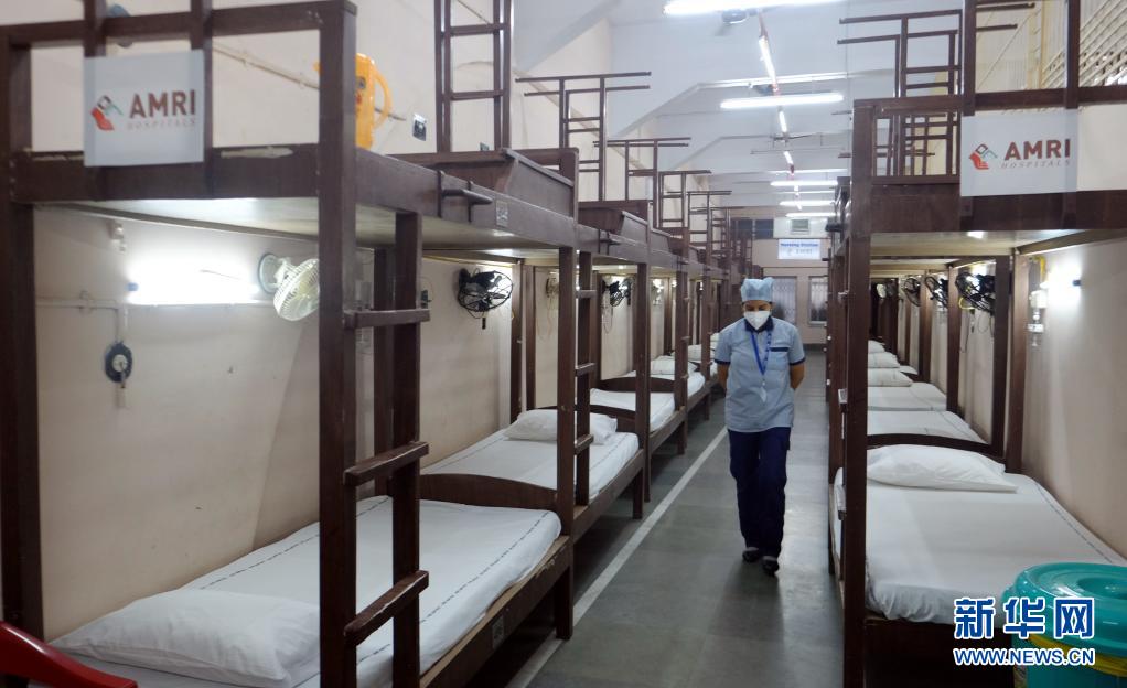 5月6日,工作人員走在印度加爾各答一處被改造成新冠隔離中心的足球場(chǎng)內(nèi)。