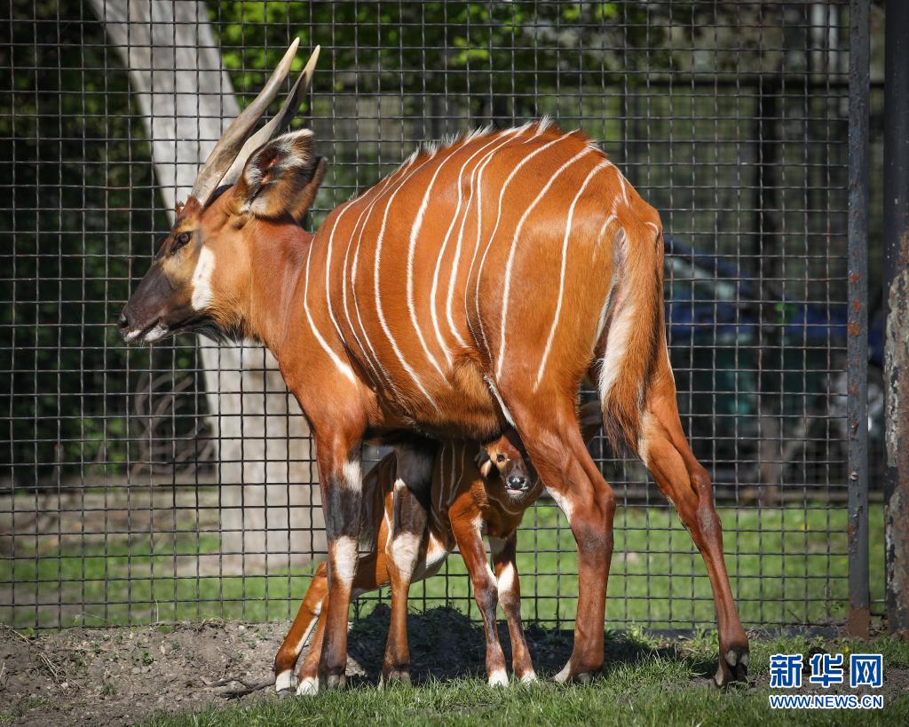 5月10日,兩周大的幼年山地紫羚與母親一起在波蘭首都華沙的華沙動(dòng)物園的籠舍中散步。