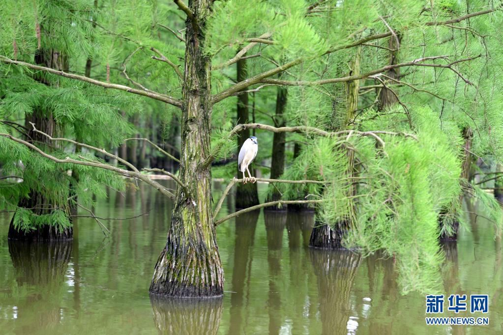 5月12日,在池杉湖國(guó)家濕地公園內(nèi),鳥兒在池杉林間休息。