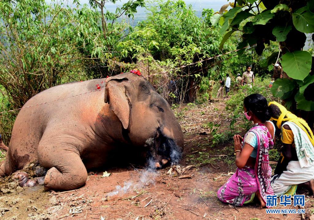 5月14日,人們在印度阿薩姆邦納加奧恩地區(qū)一頭死去的象旁禱告。