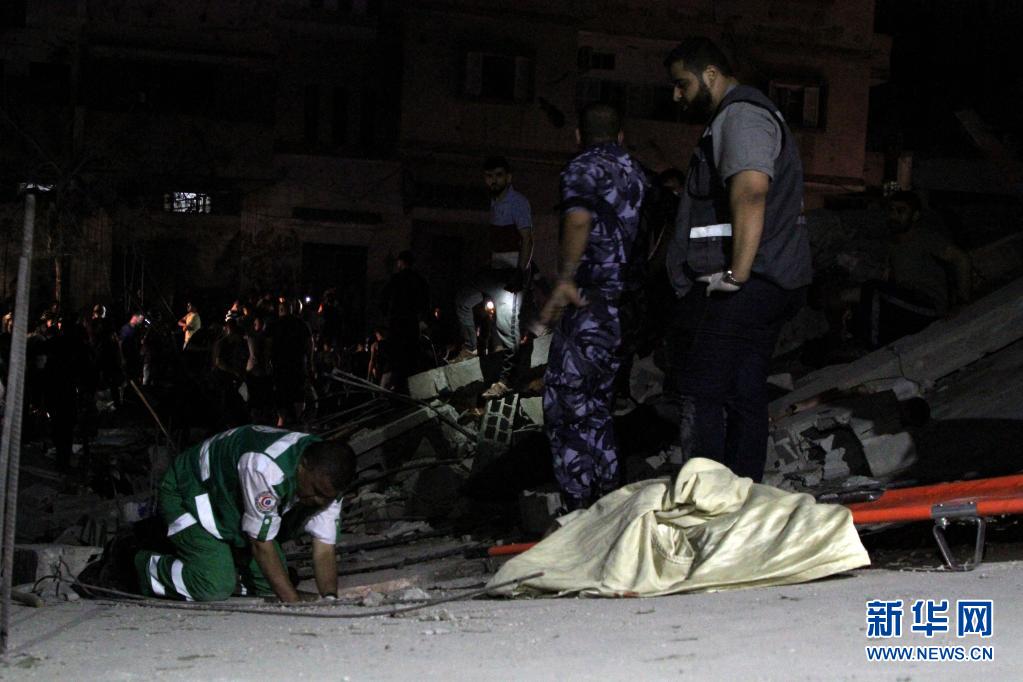 5月15日,救援人員在加沙城的空襲廢墟中搜救。