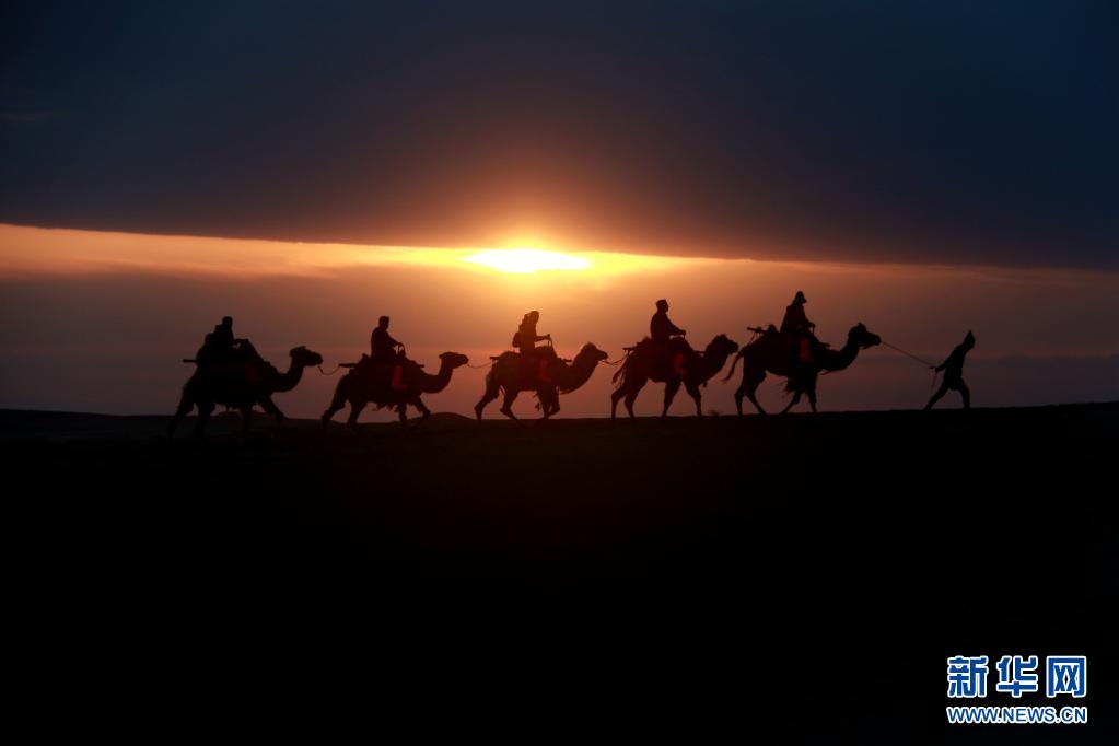 5月15日,游客騎駱駝在甘肅省敦煌市鳴沙山月牙泉景區(qū)游覽。晨光下,云彩、沙山、駝隊(duì)構(gòu)成了一幅美麗迷人的畫卷。新華社發(fā)(張曉亮 攝)