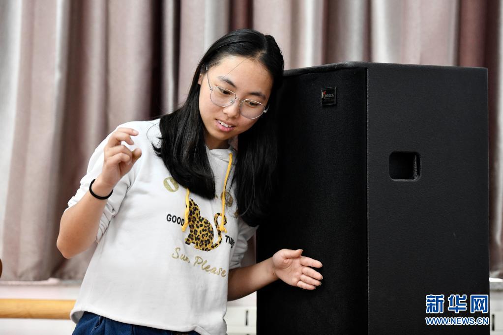 天津理工大學(xué)聾人工學(xué)院聾人舞蹈隊(duì)隊(duì)長楊凝在排練時用手接觸音響感受震動(5月12日攝)。新華社記者 趙子碩 攝
